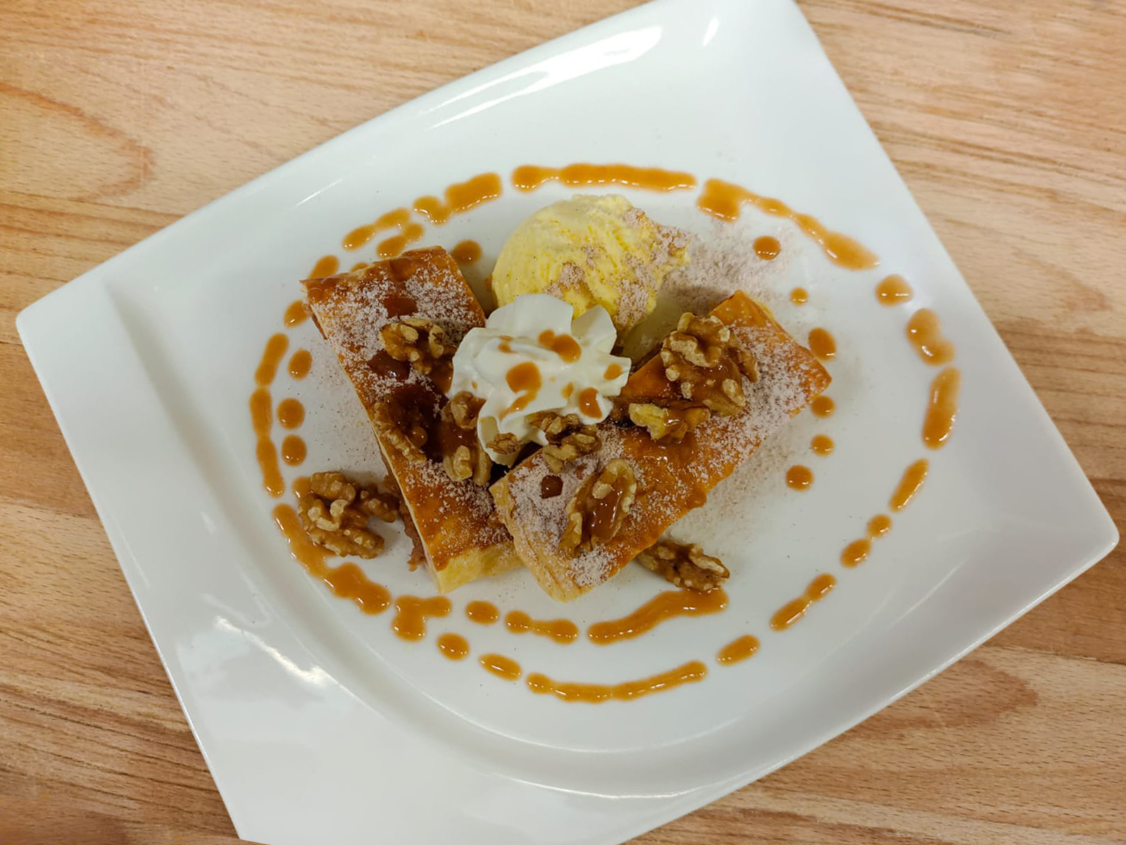 Plněná palačinka švestkovými povidly, čerstvým ovocem a zmrzlinou - Restaurace U Zlatého lva